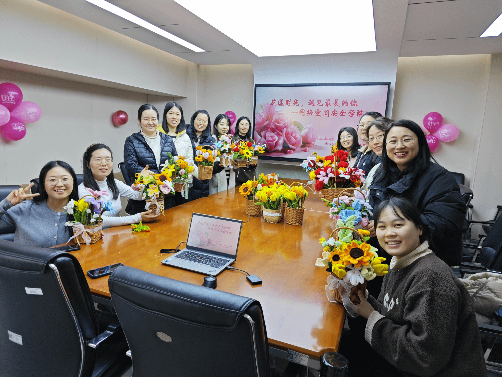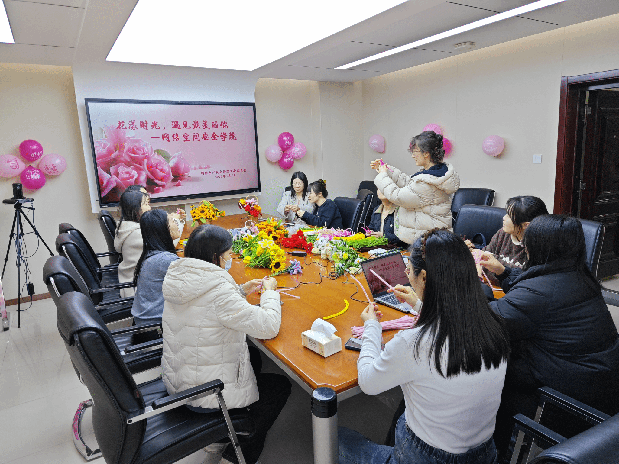 活动现场布置温馨雅致,各色花材与手工工具一应俱全,处处洋溢着轻松愉悦的节日氛围。活动伊始,手工花制作体验环节正式开启,大家手持花材、工具,在动手创作中感受手工艺术的魅力。从花型挑选、配色到整篮搭配,每一位女教职工都匠心巧思、认真雕琢,将对生活的美好期许融入指尖,一朵朵精致的手工花在巧手下绽放,一个个独一无二的花艺作品逐渐成型。亲手制作的花艺不仅是一份别致的节日礼物,更让大家在动手创作中舒缓了工作压力,体验到艺术疗愈的乐趣。