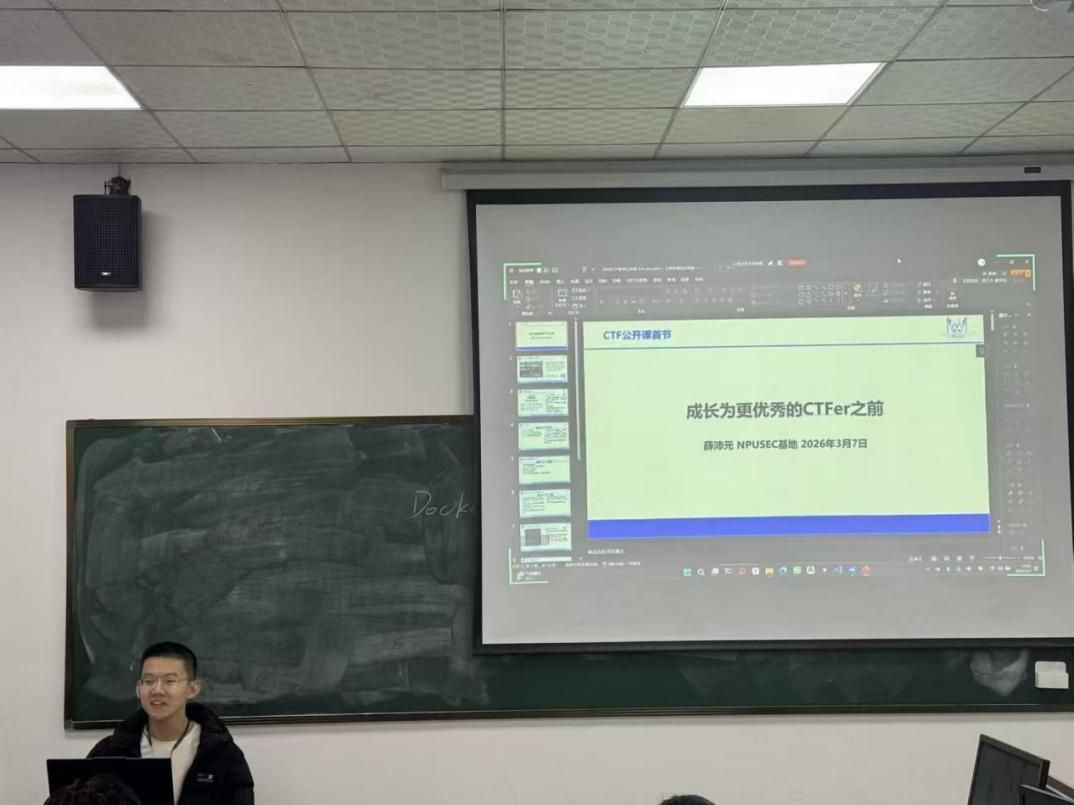 在核心内容讲解后,基地成员薛沛元带来了“干货满满”的CTF入门分享,从线上学习应用推荐、工具环境配置,到网络自学方法、编程语言要求,再到命令行实操,全方位为同学们扫清线上入门障碍,夯实CTF学习的实操基础,适配线上自主学习与练习场景。他还结合自身丰富的参赛与线上学习经历,分享了CTF竞赛学习的宝贵经验与关键能力:坚持不懈的钻研精神、直面难题的抗压能力、互帮互助的团队意识、严谨细致的做事态度。CTF的学习路上难免遇到难解的题目、难以突破的瓶颈,唯有相信自己,才能持续不断提升自我。