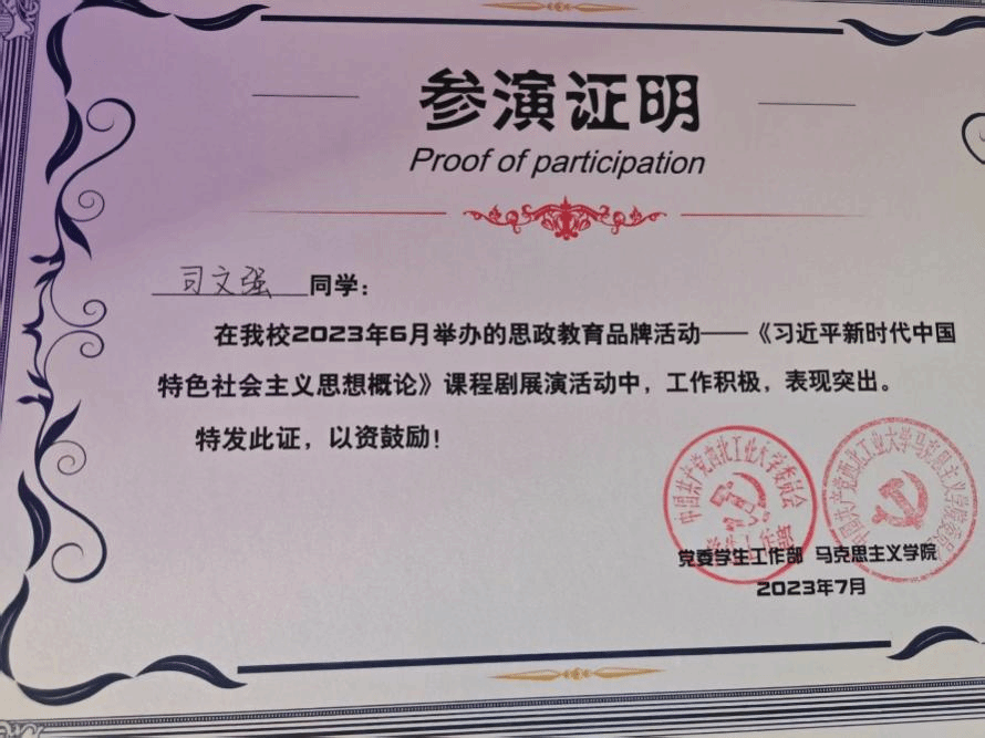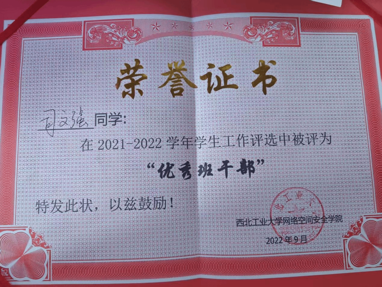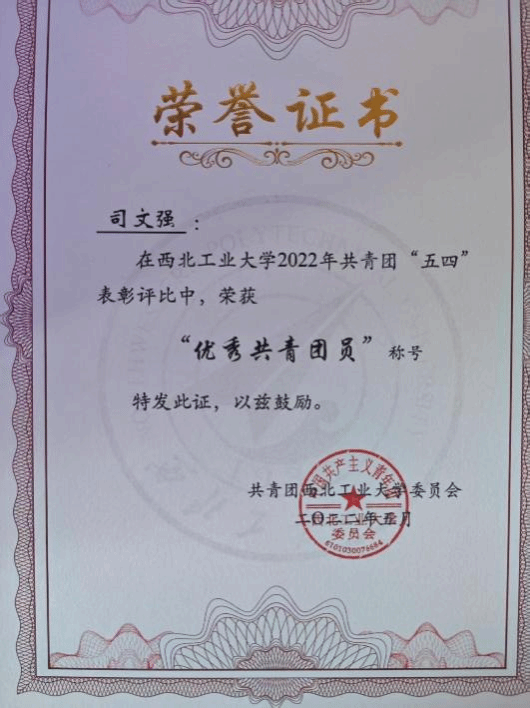 心怀报国之志,不忘来时初心。司文强刚入学便向党组织递交了入党申请书,积极向党 组织靠拢,并于2024年5月13日正式成为一名中共党员。他积极参与各类活动,如青马工程骨干培训班、党员读原著等。在担任班长期间,积极发挥党员的先锋模范作用,切实为同学办实事。