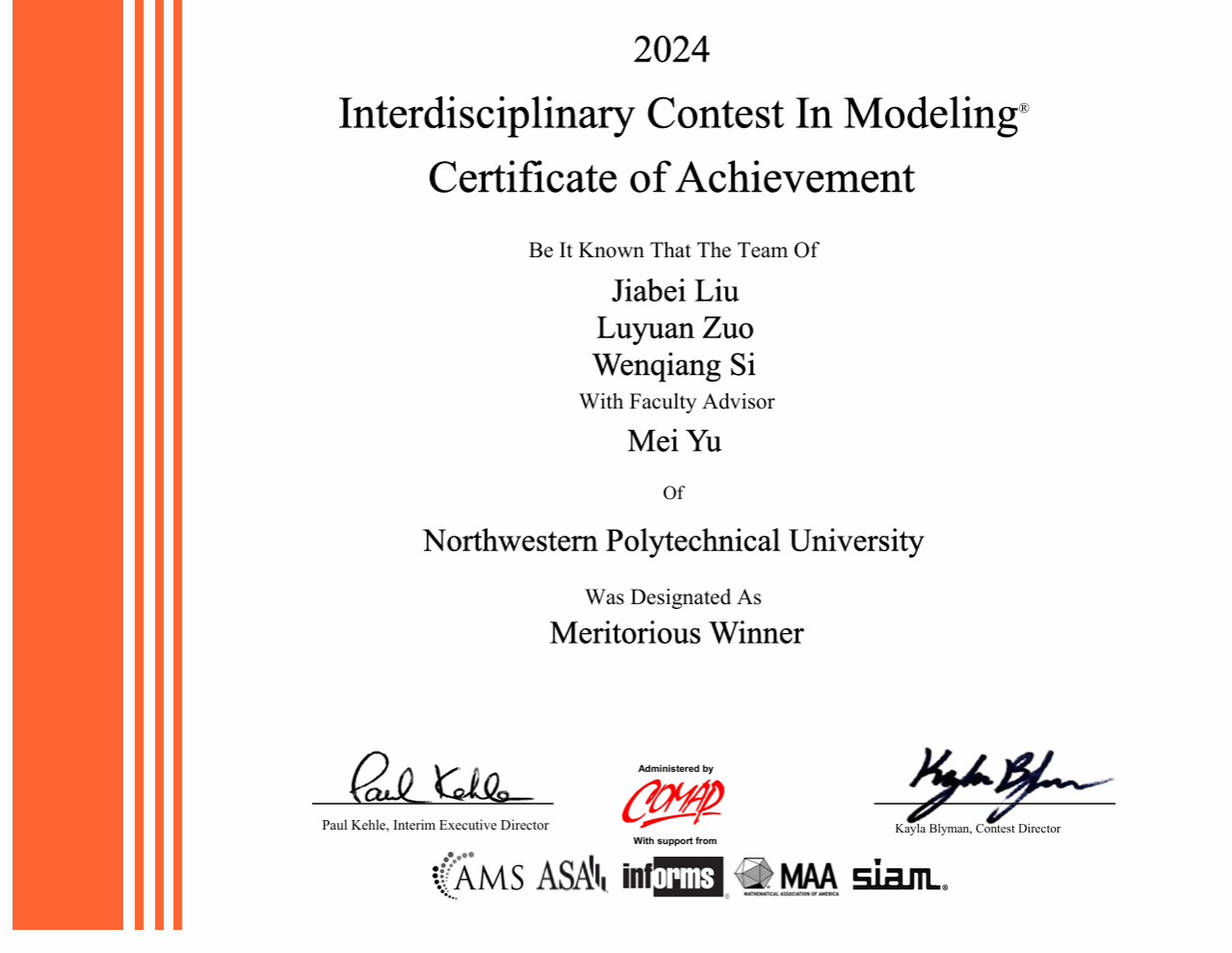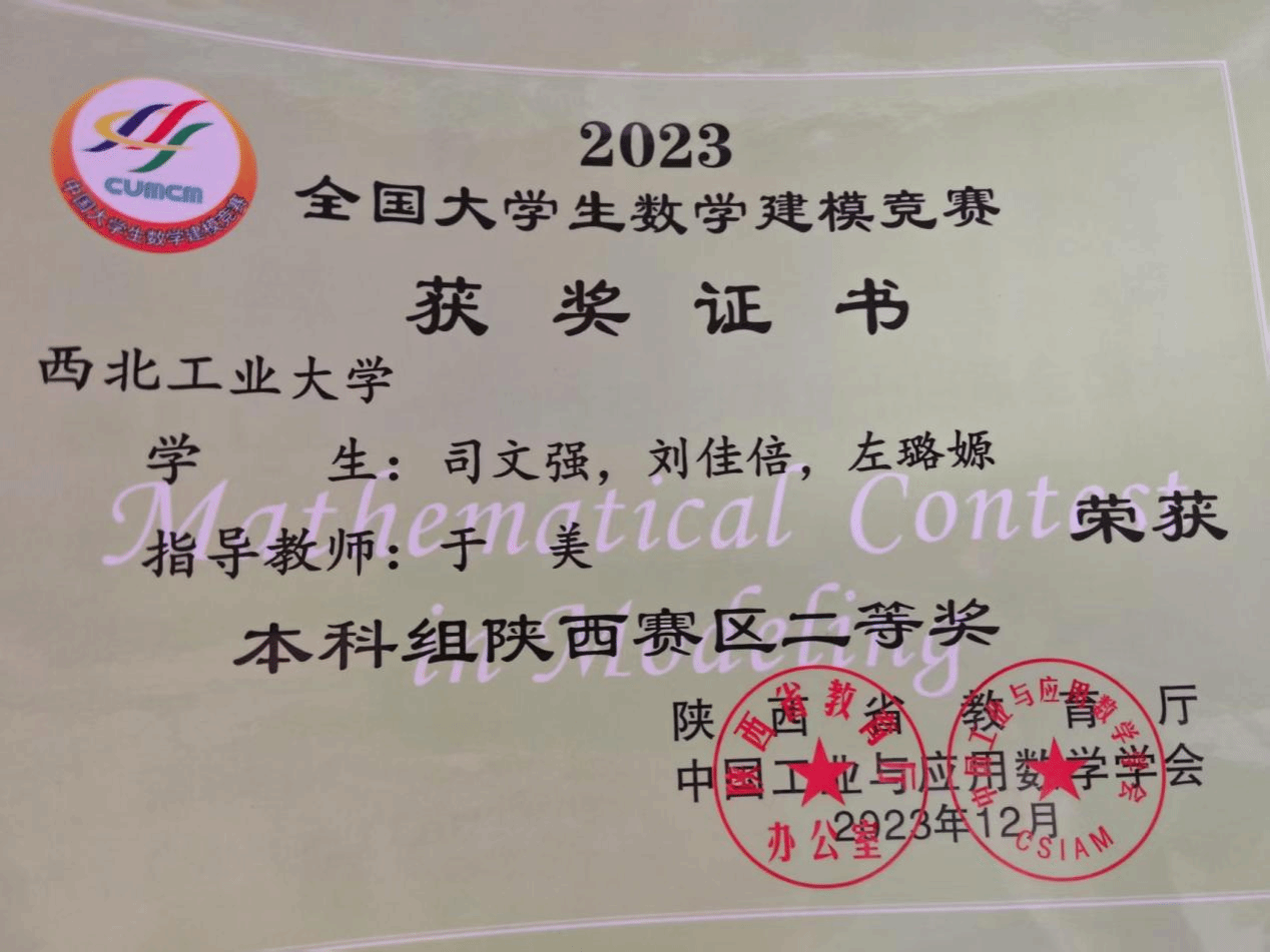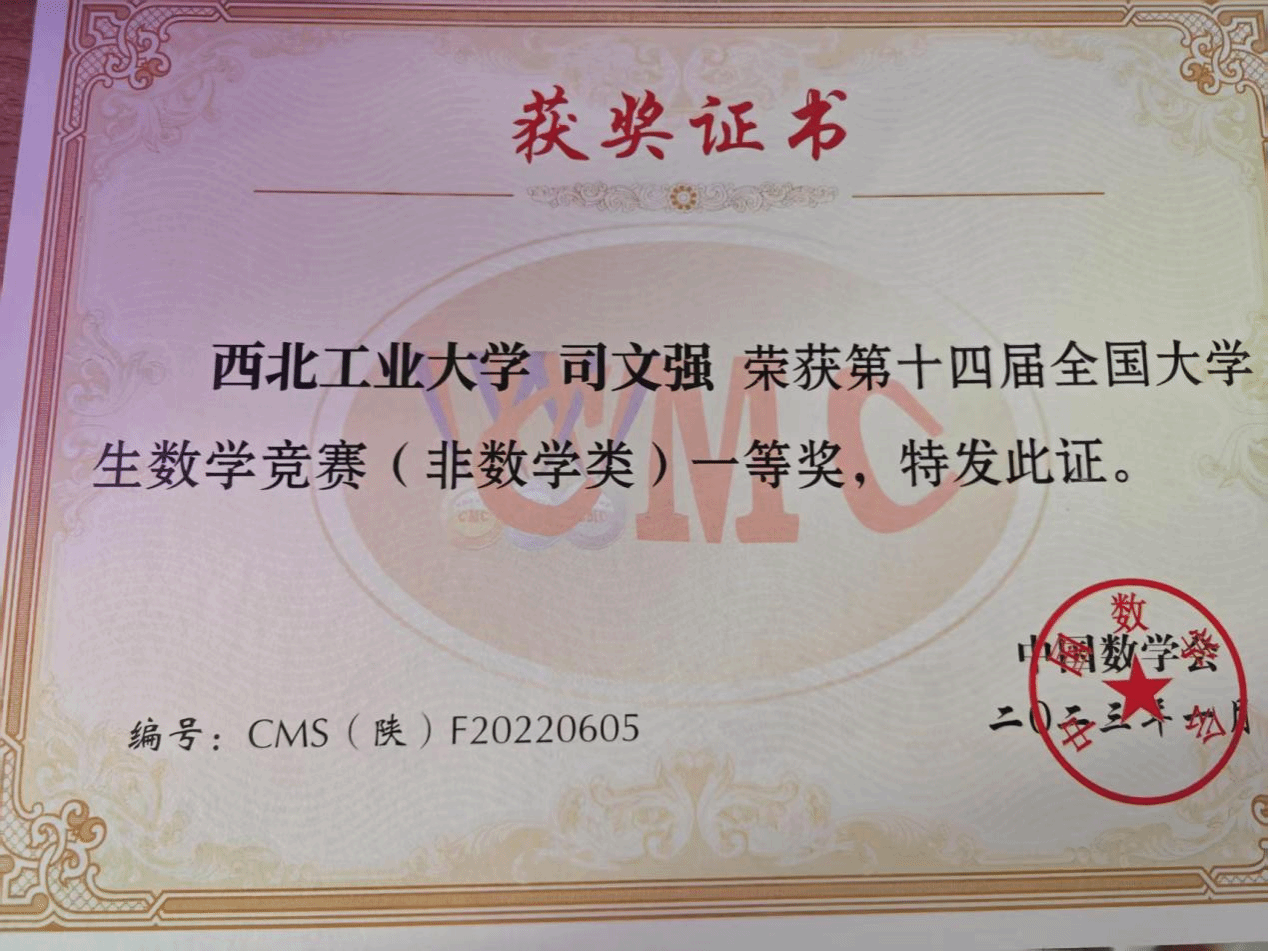 司文强始终秉承踏实勤奋的学风,热衷于参加各类学科竞赛。本科期间,积极参与数学相关竞赛,带领队伍多次参加数模竞赛,主要负责编程和建模工作,取得了陕西省二等奖、美赛M奖的优异成绩;积极参与数学竞赛,取得了省级一等奖的优异成绩。同时,司文强积极参与全国大学生创新创业大赛、互联网+,在实践中提升自己的科研能力。