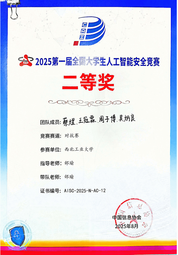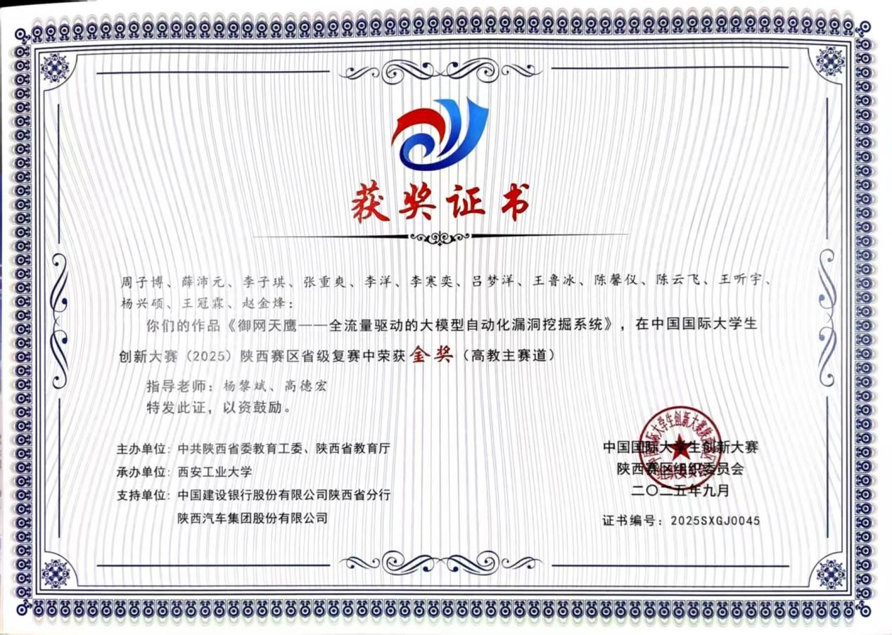 科研竞赛中,他勇于探索、敢于创新。作为核心成员参与国家级大学生创新创业训练计划项目《面向挑战场景的无人机视觉定位系统》并取得良好结题;在第二届“长城杯”铁人三项赛(作品赛)中荣获全国一等奖,在“强网杯”创新创业专项赛中取得全国三等奖,带领团队获得中国国际大学生创新大赛国家级银奖,展现出扎实的专业功底与团队协作能力。
